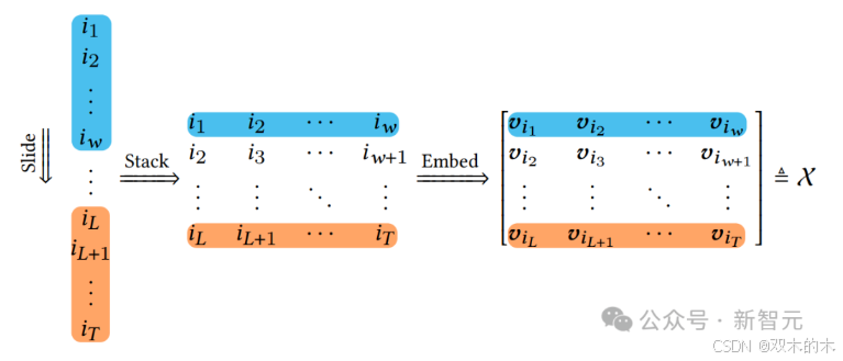 如下图所示,用户阅览窗口的处理步骤为:首先,一个固定大小为ω的窗口在整个原始内容序列中滑动。然后将内容的多个窗口以内容矩阵的形式堆叠在一起。最后将每个内容映射到其d维内容嵌入,得到轨迹张量𝒳。