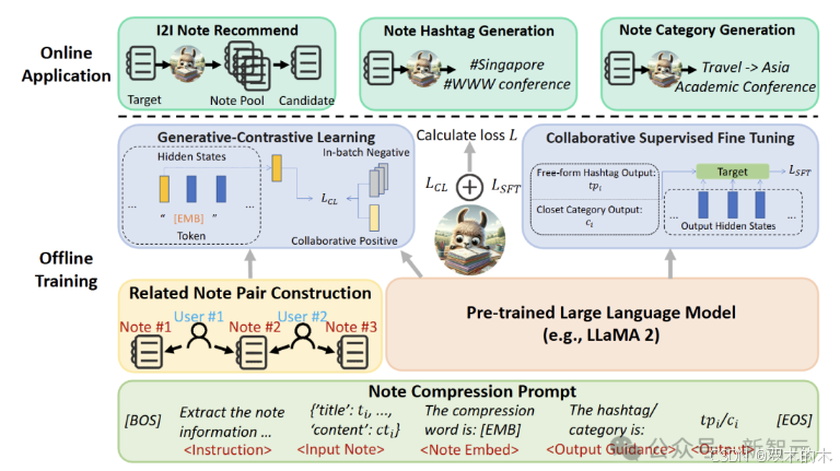 NoteLLM把GCL和CSFT任务结合起来建模,旨在潜在地提高嵌入的质量。研究者将这两个任务整合到一个提示中,给它们提供额外信息,同时简化训练流程。