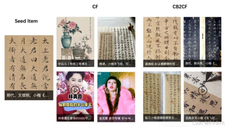 下图展示了给定一个描述中国书法的低参与度内容时,从CF和CB2CF生成的最相似内容的示例。显然,在这种情境下,所提出的CB2CF方法能够检索到更多相似内容,而CF则检索到了与娱乐和绘画相关的内容。