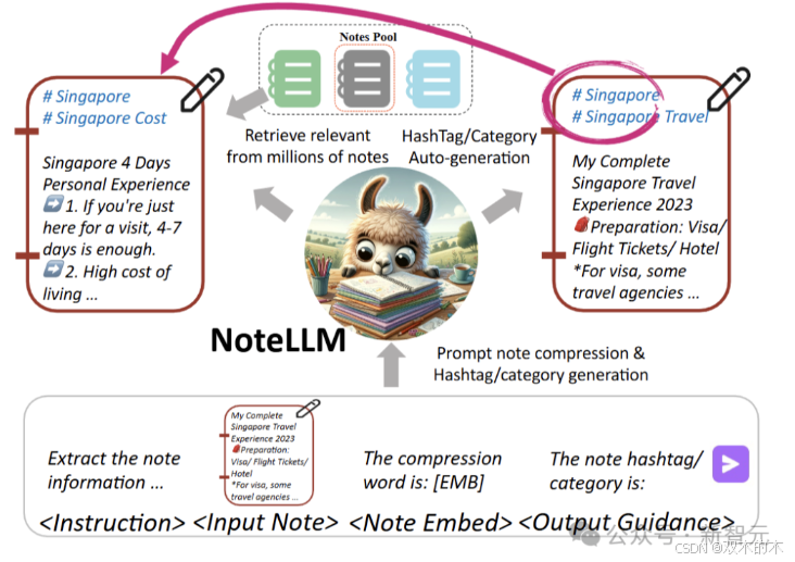 具体来说,通过「笔记压缩提示词」将笔记浓缩成特殊的单一token,再借助对比学习方法,进一步学习潜在相关笔记的嵌入关系。同时,NoteLLM还能对笔记进行总结,通过指令调优自动生成标签或类别。