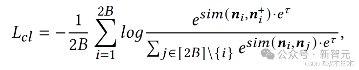 其中,𝐿𝑐𝑙表示GCL的损失,𝜏为可学习的温度参数,𝑠𝑖𝑚(𝑎,𝑏)=𝑎⊤𝑏/(∥𝑎∥*∥𝑏∥) 表示向量𝑎和𝑏的相似度。