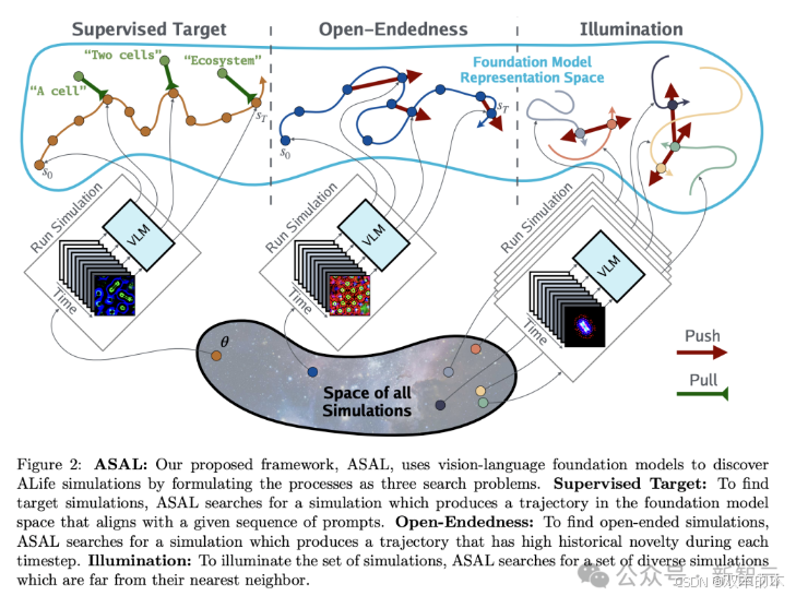 基于这个思路,团队提出了自动化人工生命搜索(ASAL)全新框架,如下图所示。