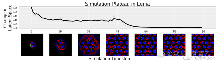 下图展示了Lenia模拟中CLIP向量随模拟时间变化的速度。该指标在模拟看起来已经定性静止时精确达到平台期,为模拟提供了一个有用的停止条件。