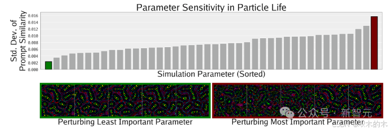 接下来的图表通过逐一调整粒子生命模拟的各个参数,并测量CLIP提示词对齐评分的标准差,来量化每个参数对模拟行为的重要性。