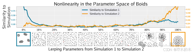 在下图中,研究人员对两个Boids模拟之间的参数进行线性插值。中间的模拟缺乏任何一个原始模拟的特性,表现为无序状态,这清楚地表明Boids参数空间具有非线性和混沌特性。