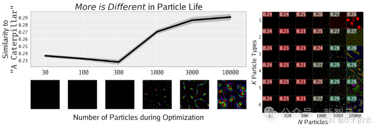 下图评估了粒子生命(Particle Life)中粒子数量对其表现特定生命形式能力的影响。