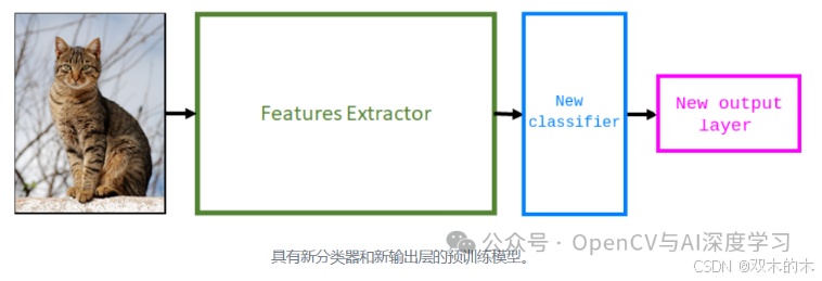 接下来,添加一个新的分类器。这涉及调整架构以解决新任务。通常,此阶段意味着添加一个新的随机初始化线性层(由下面的蓝色块表示)和另一个具有多个单元的线性层,该单元的数量等于数据集中的类数(由粉色块表示)。