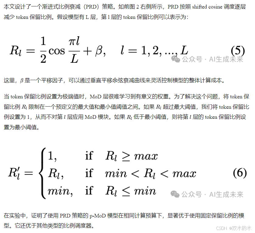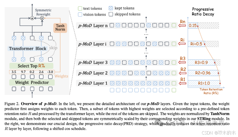 本节介绍 p-MoD 模型。如下图 2 所示,本文的模型由 p-MoD 层组成,这些层通过 tanh 门控权重归一化(TanhNorm)和对称 token 重加权(STRing)来升级 MoD 架构。关键的设计是渐进式比例衰减(PRD)策略,它控制不同层之间的 token 保留比例。接下来的部分中,将首先简要回顾 MoD,然后详细解释p-MoD 模型的每个组件。