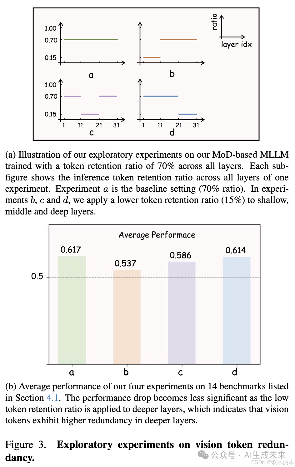 为了验证本文的假设,在基于 MoD 的 MLLM 上进行了一系列探索性实验,在所有层中设置 70% 的 token 保留比例。如下图 3a 所示,首先将层划分为若干组。在每个实验中,仅对其中一组层应用较低的 token 保留比例(15%),而保持其他层不变,并在 14 个基准上评估该模型的表现。图 3b 中的结果强烈支持了我们的假设:将较低的 token 保留比例应用于越深的层,性能越好。这表明,视觉 tokens 在较深的层中具有更高的冗余性,这与之前的研究 [4, 45] 的观察结果一致。