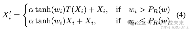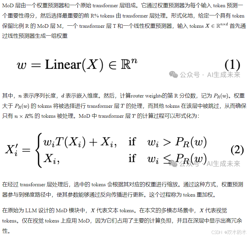 与用于训练 MoD 基于 LLMs 的文本数据相比,MLLMs 是在规模小几个数量级的多模态数据上训练的。训练一个权重预测器(MoD 模块中唯一可学习的部分)来准确且稳健地评估视觉 tokens 的重要性并分配相应的权重是具有挑战性的。权重预测器模块的梯度来自于 token 重加权过程。原始 MoD 仅对选中的 tokens 进行 token 重加权,如方程 2 所示。这样,语言监督信号仅监督权重预测器为选中的 tokens 分配高权重,而对跳过的 tokens 的权重预测过程没有监督(即没有梯度)。