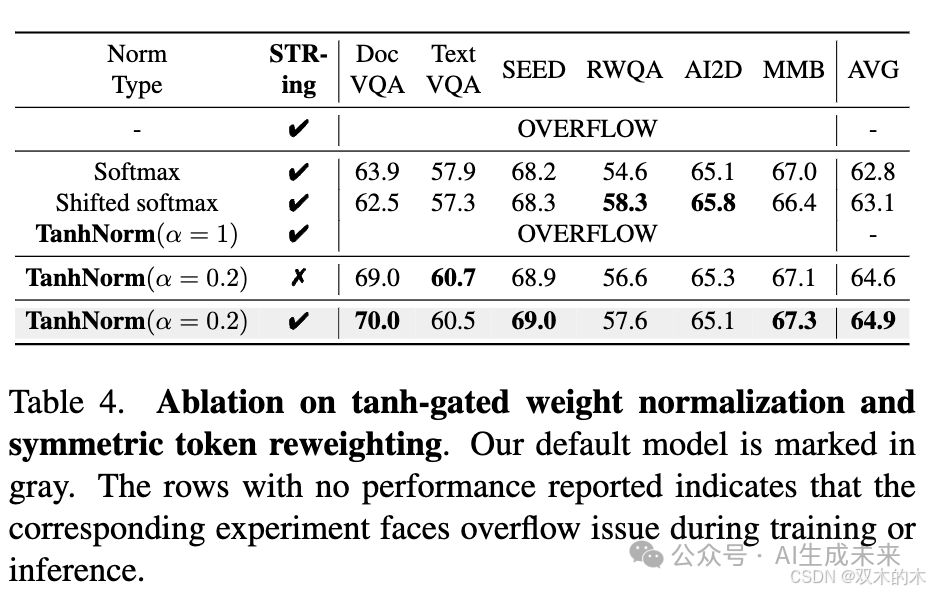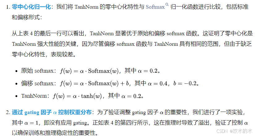Tanh-gated 权重归一化通过与不同的权重归一化方法进行比较来验证 TanhNorm 的有效性,如下表 4 所示。首先,确认使用没有权重归一化模块会导致训练过程中出现溢出,如第一行所示。然后,探讨 TanhNorm 的两个重要特性: