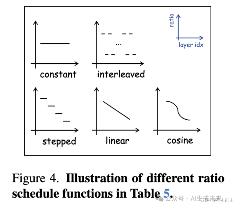 为了验证渐进比例衰减(PRD)策略的有效性,进行了四个不同调度函数的实验,这些函数控制解码器层中的 token 保留比例。这些函数包括: