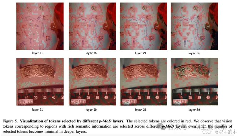 下图 5 展示了 p-MoD-LLaVA-NeXT 在不同层次上选择的 tokens。通过渐进比例衰减策略的引导,MoD 层处理的 tokens 数量逐层逐渐减少。从中可以观察到,选中的视觉 tokens 在图像中逐步集中于具有丰富语义信息的关键区域。具体而言,在上面的图中,位于不同位置的文本和图形所对应的视觉 tokens 几乎都在第 26 层以较低的比例被选中。在下面的图中,选中的 tokens 渐渐集中于标尺上的度量标记和其他物体。这些结果表明,我们的模型通过保留有信息的 tokens 有效地压缩了视觉信息,从而在显著降低训练和推理成本的同时,保持了良好的性能。