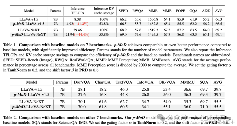 将 p-MoD 集成到 LLaVA-1.5 和 LLaVA-NeXT 基线模型中,并在 14 个基准上进行了全面评估,如下表 1 和表 2 所示。与基线模型相比,p-MoD-LLaVA-1.5 和 p-MoD-LLaVA-NeXT 在所有基准上都实现了可比甚至更好的性能,同时显著节省了推理 TFLOPs 和 KV 缓存存储。