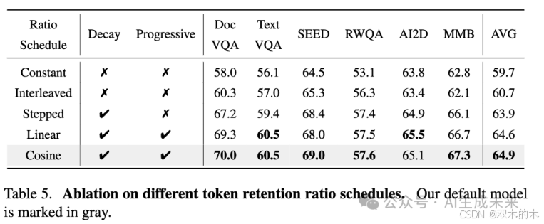 连续衰减函数,如余弦和线性衰减,显著优于不连续的阶梯衰减函数。在这些方法中,余弦衰减函数取得了最佳结果,证明了我们采用的 shifted cosine 调度在优化层间 token 保留比例方面的有效性。