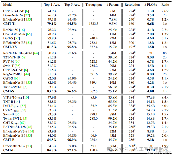 例如,CMT-S通过这两者的结合,开发出了一种在图像识别任务上性能优异的网络,在ImageNet上的top-1准确率达到了83.5%,同时在FLOPs上比现有的DeiT模型小14倍,比EfficientNet小2倍。