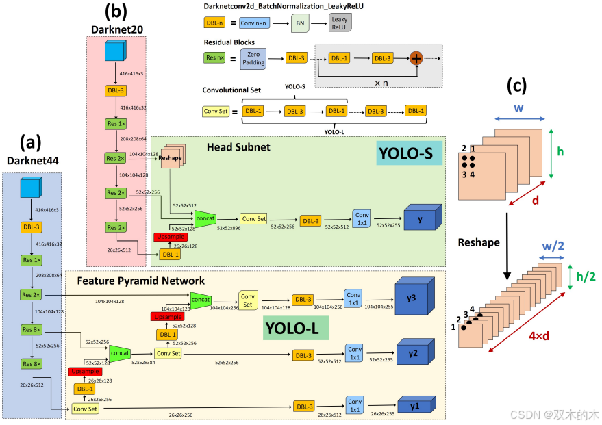 我们以YOLO-S为例,如上图b所示,是一个微小而快速的网络,它利用图c所示的特征融合和重塑穿透层的概念,将早期细粒度特征图的精确位置信息与分辨率较低的深层特征图的有意义语义信息相结合。基本上,它基于Darknet20主干,在特征提取阶段用交错卷积层和残差单元取代Tiny-YOLOv3的最大池化层,以减少下采样期间的信息损失,并有效地增加感受野。由七个残差块组成的轻量级主干还可以避免对小规模检测到的目标进行无用的卷积操作,否则在更深的架构中,这可能会导致在多次下采样后只剩下几个像素的最终特征此外,YOLO-S采用了一个具有单个输出规模52×52的head subnet和一个仅由4个交替卷积层1×1和3×3组成的较小卷积集,而不是YOLO-L和YOLOv3中的6个,以加快推理。这导致输出的感受野大到101×101,一旦源图像被重新缩放到网络预期的大小,就足以获得目标周围有意义的上下文信息。