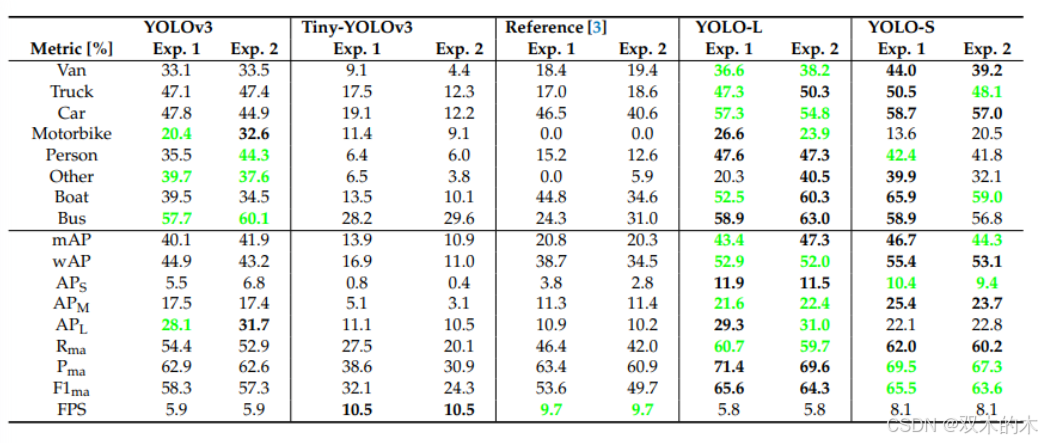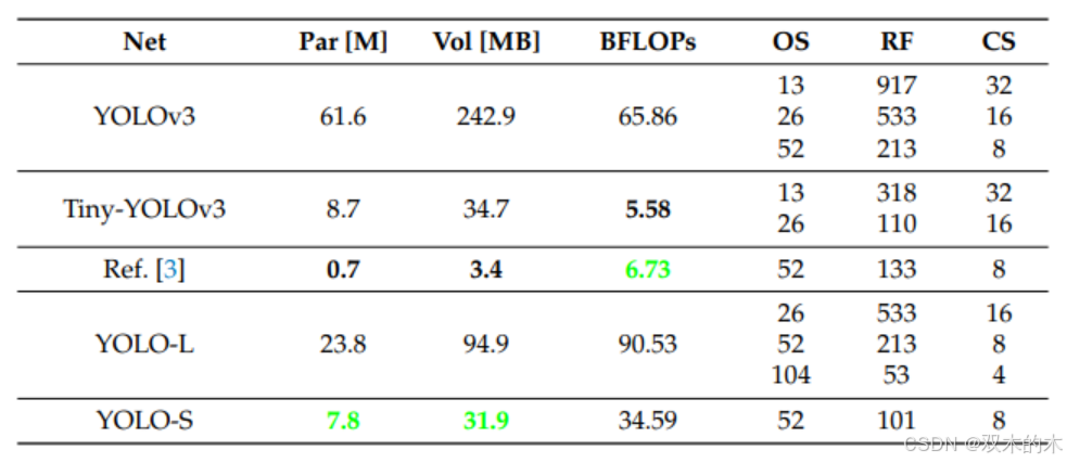 总体而言,YOLO-S的模型体积比YOLOv3缩小了87%(YOLO-S尺寸仅为YOLOv3的7.9%),并且包含了近7.853M的可训练参数,因此甚至比Tiny-YOLOv3轻10%。此外,它需要34.59个BFLOP,接近SlimYOLOv3-SPP3-50,几乎是YOLOv3的一半,如上表所示。然而,在实验中,所提出的模型YOLO-S在准确性方面优于YOLOv3。