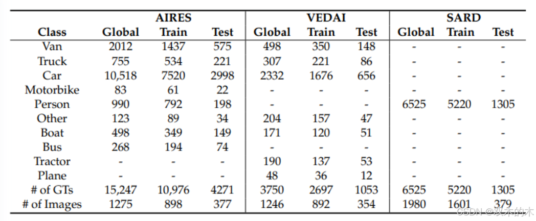 研究者介绍了AIRES(cAr detectIon fRom-hElicopter imagesS),这是一个新的车辆数据库,由1920×1080分辨率的航空全高清(FHD)图像组成,由WESCAM MX-15 EO/IR成像系统传输,该系统放置在多传感器四轴陀螺稳定炮塔系统中,安装在载人警用直升机AW169的前端。直升机在近300米至1000米的不同高度飞行,不同的摄像机角度从约5°至80°不等。这些图像是2019年6月至9月在两个不同的地理区域拍摄的:意大利北部的伦巴第大区和挪威的奥斯陆市。该数据集由1275张用LabelImg软件[36]注释的图像组成,包含15247个注释的地面实况(GT)对象,分为八类:面包车、卡车、汽车、摩托车、人、其他、船和公共汽车。统计数据汇总在表1中:大多数类别是汽车,而人口较少的类别是摩托车,占0.5%,其他类别占0.8%,后者包括推土机和建筑工地使用的其他地面移动车辆。