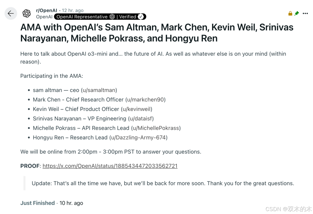 o3-mini 发布后,OpenAI CEO Sam Altman 带领首席研究员 Mark Chen、首席产品官 Kevin Weil、工程副总裁 Srinivas Narayanan、API 研究主管 Michelle Pokrass,和 o3-mini 团队研究主管 Hongyu Ren,一起参与了 Reddit AMA 讨论会。