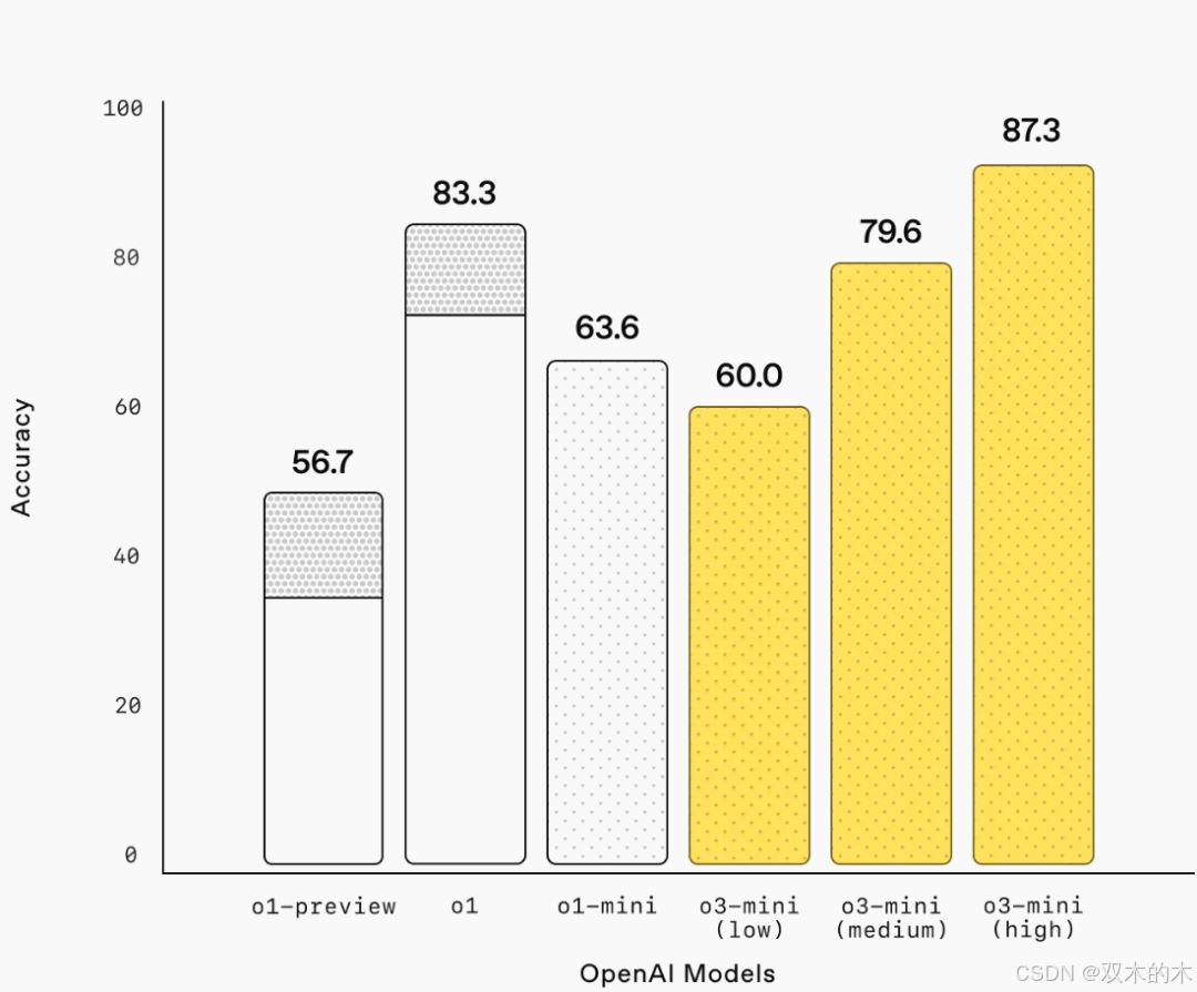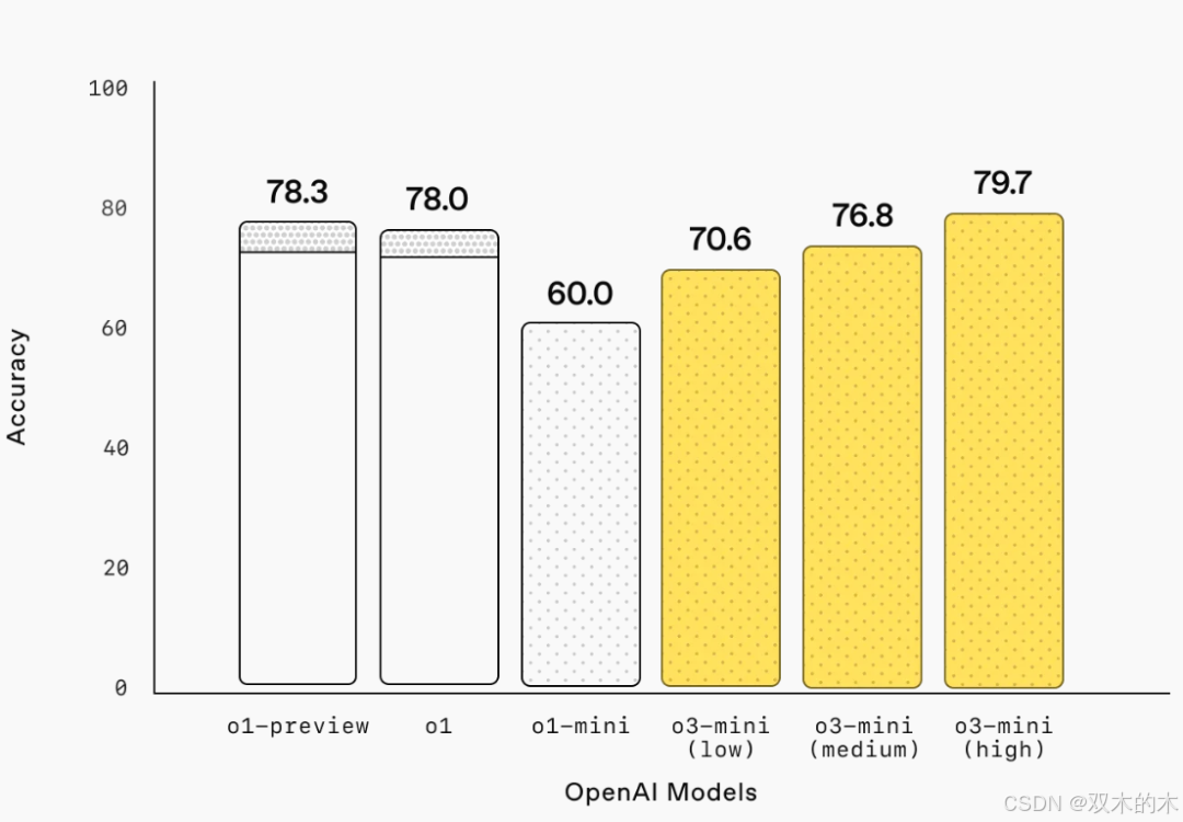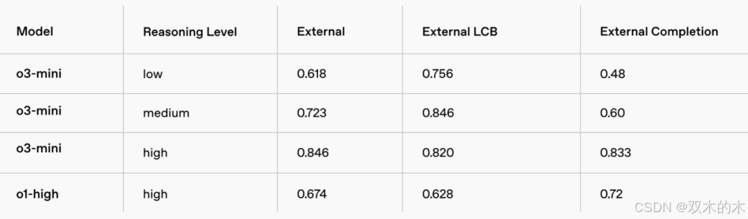博士极科学问题:o3-mini-low 的表现优于 o1-mini。o3-mini-high 的表现与 o1 相当,在博士级生物学、化学和物理问题上都显示出显著进步。