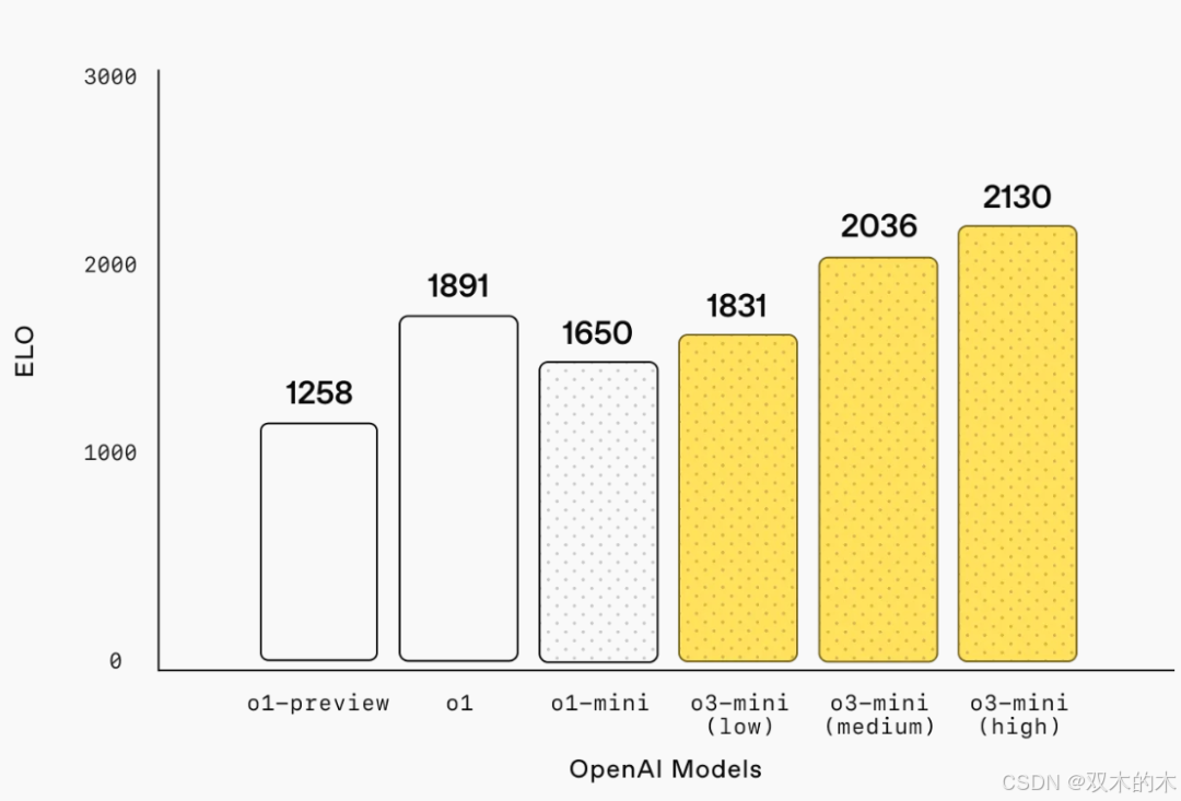 在 Codeforces 编程中, o3-mini 随着推理努力级别的提高获得了越来越高的 Elo 分数,均优于 o1-mini。o3-mini-medium 达到了与 o1 相当的表现。