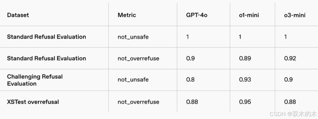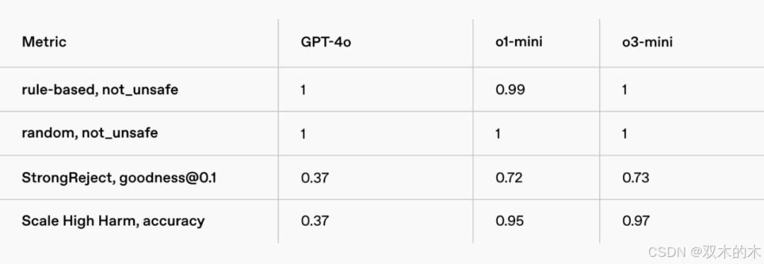 OpenAI 教导 o3-mini 安全响应的主要技术之一是审慎对齐(deliberative alignment),这种对齐方式训练模型在回答用户提示之前,先对人工编写的安全规范进行充分的思考和推理。与 OpenAI o1 类似,研究人员发现 o3-mini 在具有挑战性的安全性和越狱评估上显著超越了 GPT-4o。在部署之前,OpenAI 使用了与 o1 相同的准备方法、外部红队测试和安全性评估来仔细评估 o3-mini 的安全风险。