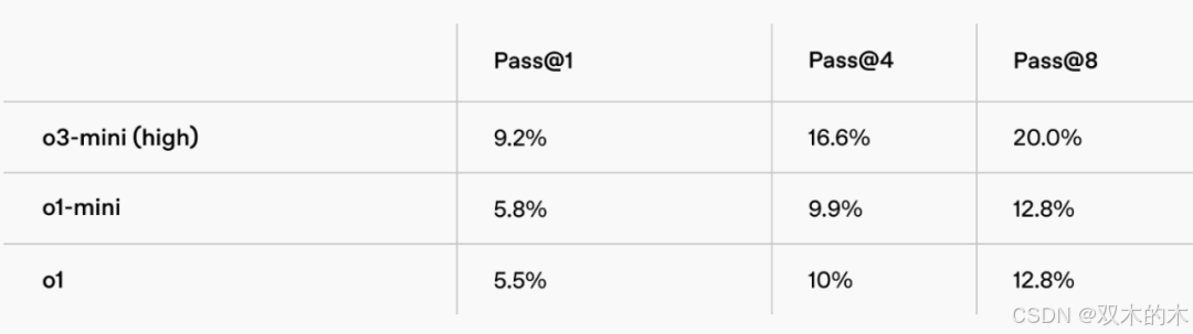 软件工程:o3-mini 是 OpenAI 发布的在 SWEbench-verified 上表现最好的模型。o3-mini-high 使用开源 Agentless 框架可达到 39% 的准确率,使用内部工具可达到 61% 的准确率。