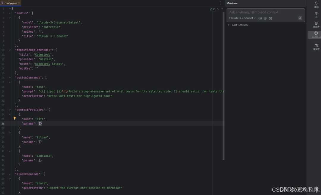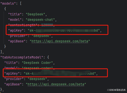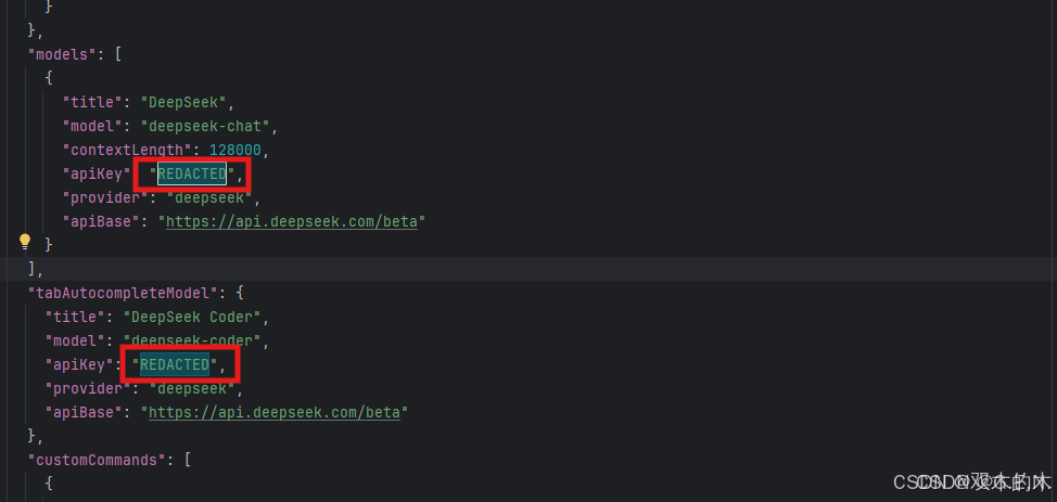 {"completionOptions": {"BaseCompletionOptions": {"temperature": 0.0,"maxTokens": 256}},"models": [{"title": "DeepSeek","model": "deepseek-chat","contextLength": 128000,"apiKey": "REDACTED","provider": "deepseek","apiBase": "https://api.deepseek.com/beta"}],"tabAutocompleteModel": {"title": "DeepSeek Coder","model": "deepseek-coder","apiKey": "REDACTED","provider": "deepseek","apiBase": "https://api.deepseek.com/beta"},"customCommands": [{"name": "test","prompt": "{{{ input }}}\n\nWrite a comprehensive set of unit tests for the selected code. It should setup, run tests that check for correctness including important edge cases, and teardown. Ensure that the tests are complete and sophisticated. Give the tests just as chat output, don't edit any file.","description": "Write unit tests for highlighted code"}],"contextProviders": [{"name": "diff","params": {}},{"name": "folder","params": {}},{"name": "codebase","params": {}}],"slashCommands": [{"name": "share","description": "Export the current chat session to markdown"},{"name": "commit","description": "Generate a git commit message"}]}