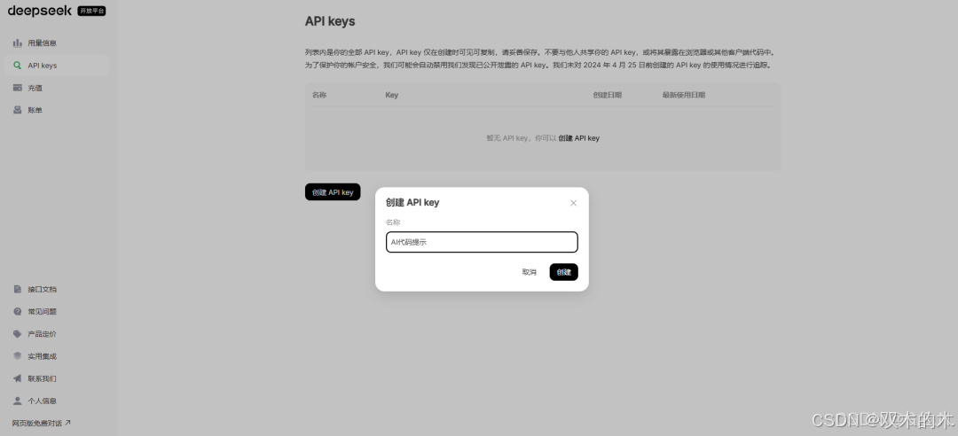 点击左侧“API Keys”,点击创建API key,输出名称为“AI代码提示”,也可以使用其它自定义的名称。