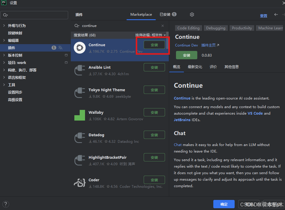 打开PyCharm,打开文件->设置->插件,搜索“Continue”,点击安装。