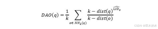 在复杂分布环境下,仅依赖邻域间的距离可能不足以刻画离群点的真实分布差异。为此,作者使用局部本质内在维度(Local Intrinsic Dimensionality,LID) 来度量数据点向周围扩散时遇到样本增长的速率。LID 通常需要借助最大似然估计(MLE)等方法进行估计,记为。基于此,可定义局部内在维度离群因子(DAO)。它在 SLOF的基础上,进一步考虑了每个邻居的局部内在维度估计值:
