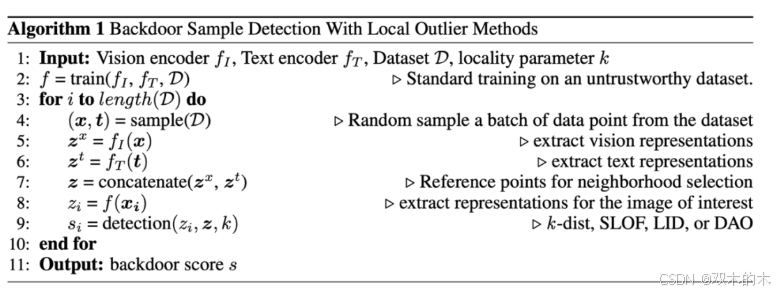 图 2 描述了将局部邻域异常检测应用于 CLIP 后门样本检测的流程。首先,利用在不可信数据集上预训练好的 CLIP 模型作为特征提取器,对一批待检测样本进行特征抽取。接着,随机选取一部分数据样本作为候选邻居集,用于后续计算 k-dist、SLOF、LID 或 DAO 等指标。随后,遍历每个样本并计算其异常值。最后,对所有样本的异常值进行排序,并根据需要移除出异常值显著偏高的样本,从而获得一个更加可信、干净的数据集。
