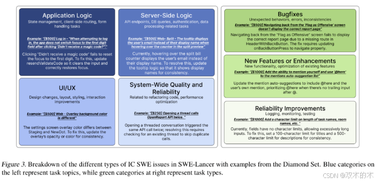 图 3 中使用 Diamond Set 中的示例对 SWE-Lancer 中不同类型的 IC SWE 问题进行细分。左侧蓝色代表任务主题,右侧绿色代表任务类型。