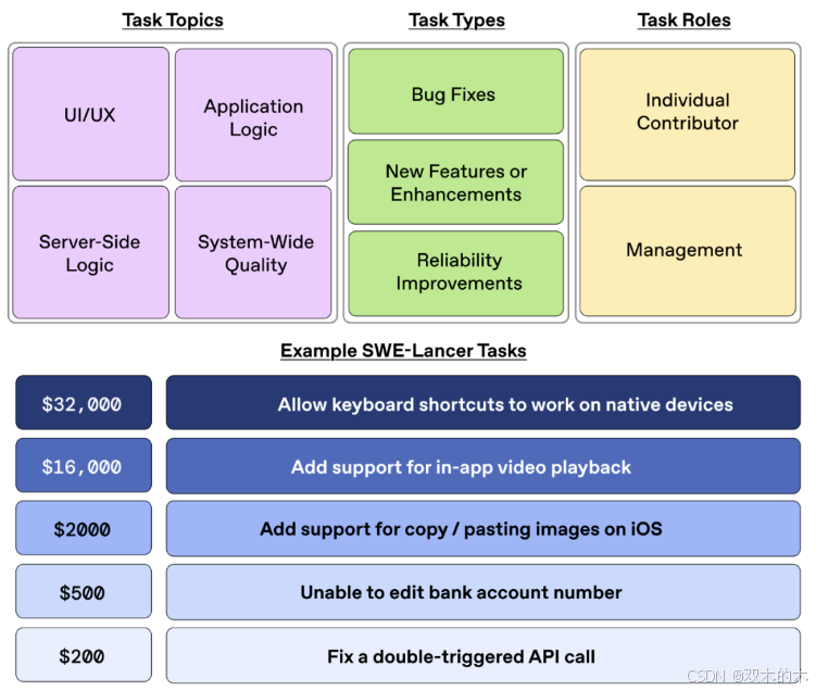 下图为 SWE-Lancer 基准中的任务目标、任务类型、任务角色以及任务示例。