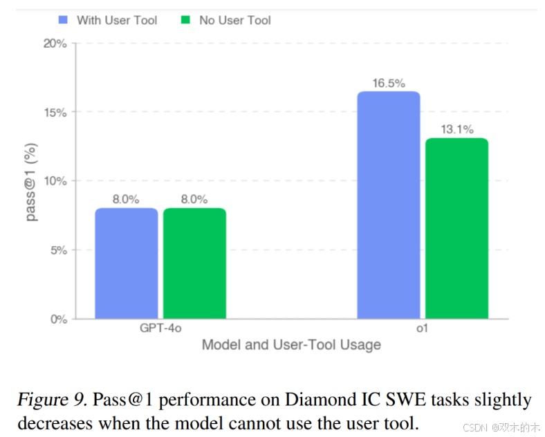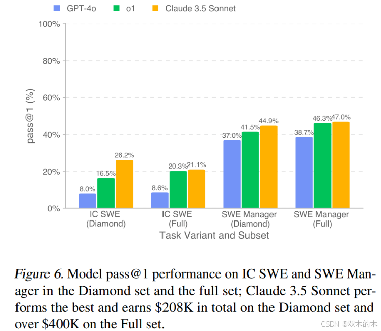 如图 6 所示,所有模型在 SWE Manager 任务上的表现均优于 IC SWE 任务。Claude 3.5 Sonnet 在 IC SWE 和 SWE Manager 任务上均表现最强,分别超出次佳模型(o1)9.7%(IC SWE 任务)和 3.4%(SWE Manager 任务)。