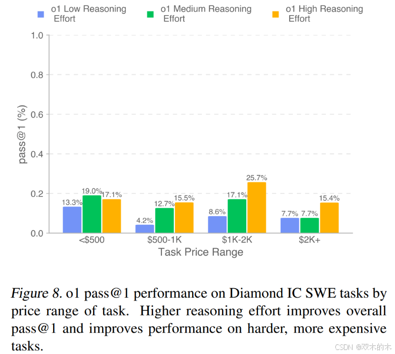 图 8 展示了不同测试时计算量(test-time compute)水平下,按任务价格范围划分的 pass@1。结果表明,增加测试时计算量可以显著提升模型在更复杂、更高价值任务上的表现。