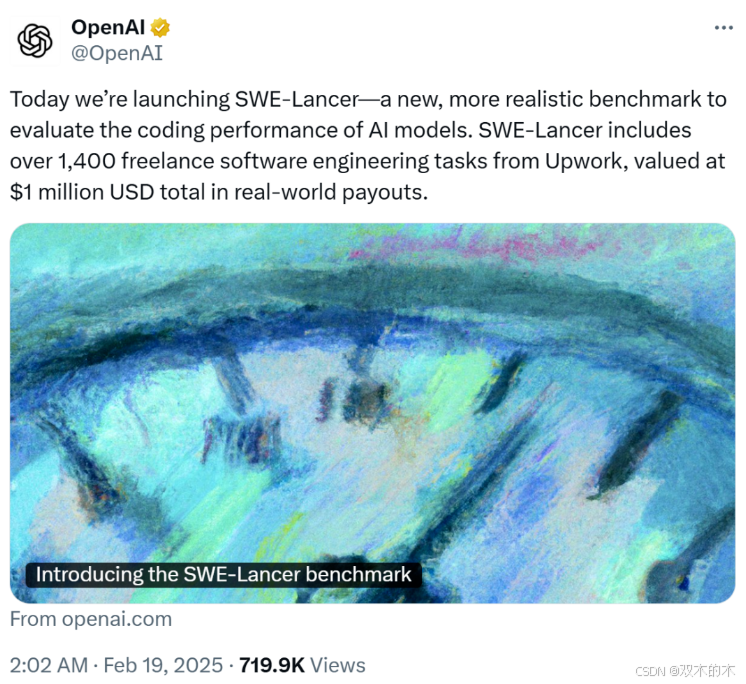 这下子,OpenAI 坐不住了,推出并开源了一个真实的、用于评估 AI 大模型编码性能的全新基准 SWE-Lancer。该基准包含了来自全球性自由职业平台 Upwork 的 1400 多个自由软件工程任务,在现实世界中总价值达到了 100 万美元。