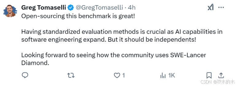 对于 OpenAI 开源的这个基准测试,有人认为很棒,并表示随着软件工程中 AI 能力的扩展,拥有标准化的评估方法非常重要,但应该是独立的。期待看到社区对 SWE-Lancer Diamond 的使用反馈。