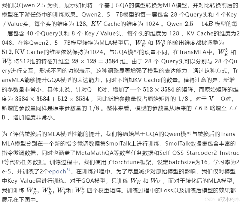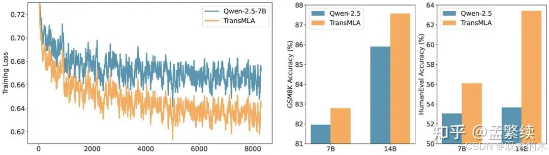 从图中可以看出,经过转换的MLA模型在训练过程中表现出更低的Loss值,表明其对训练数据的拟合能力更强。在7B和14B模型的设置下,TransMLA模型在数学和代码任务上的准确率显著高于原始的基于GQA的模型。这表明,TransMLA不仅提升了模型的表达能力,还在特定任务上带来了显著的性能改进。