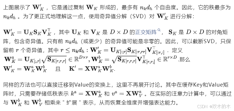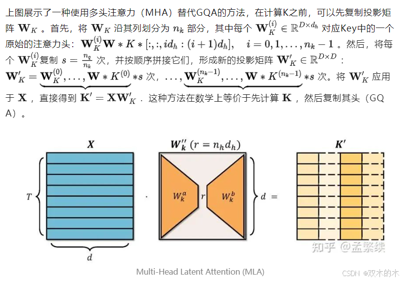 在Deepseek V2出来后,MLA架构巧妙地设计吸引了我。启发我做出CLOVER(https://arxiv.org/abs/2411.17426)这篇文章。MLA中存在一个absorb操作,能将Key Weight吸收到Query Weight中,Value Weight吸收到Output Weight中,缺点是合并后参数量会变大。CLOVER先合并再分解,不改变模型结构就能得到正交的注意力头,对剪枝和微调都有很大的好处;