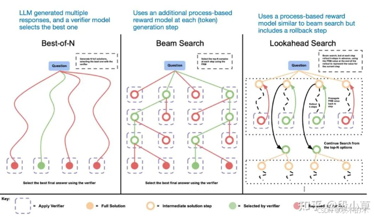 不同的基于搜索的方法依赖于一个过程-奖励模型来选择最佳答案。来自《LLM测试时计算》论文的注释图,见:https://arxiv.org/abs/2408.03314