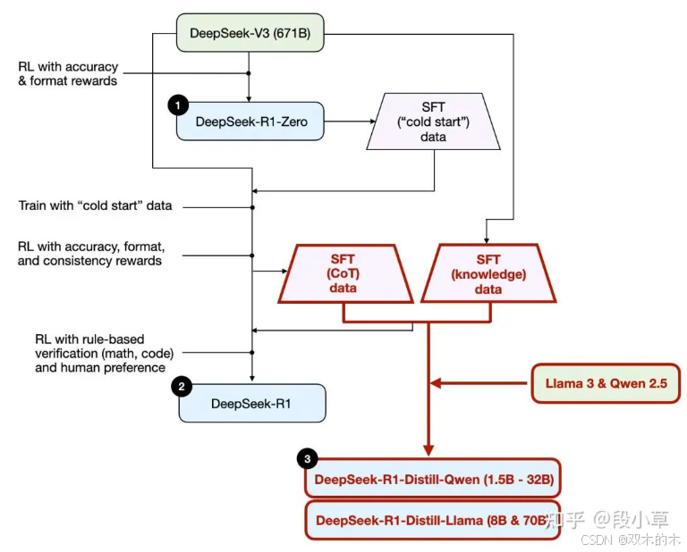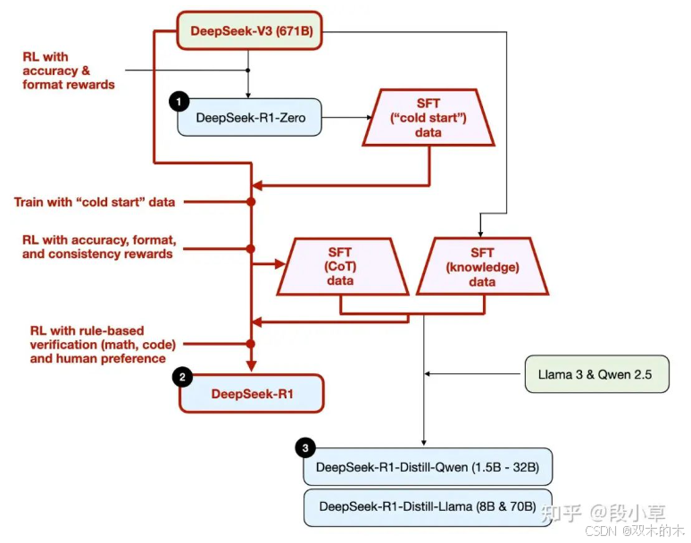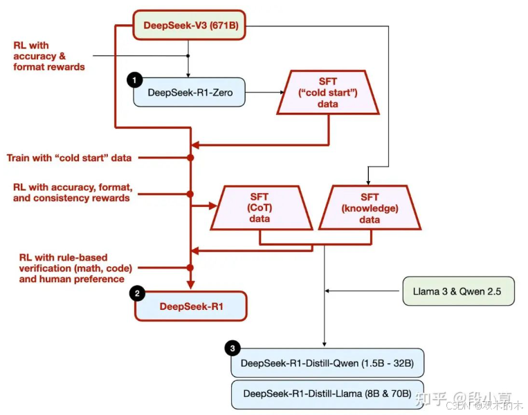 • 监督微调(SFT)+强化学习(RL),这导致了 DeepSeek 的旗舰推理型模型 DeepSeek-R1 的诞生。