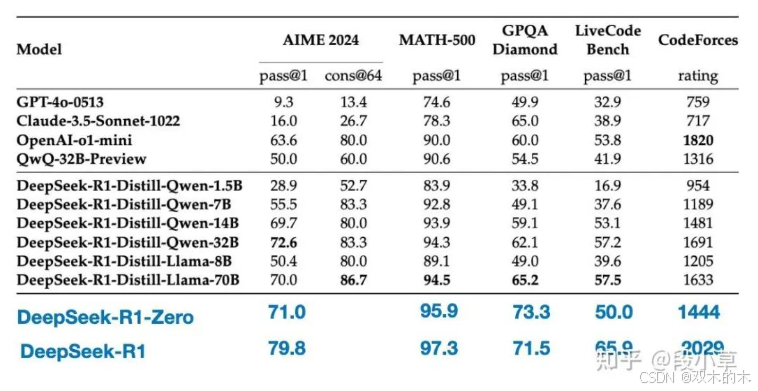 最终模型 DeepSeek-R1 相较于 DeepSeek-R1-Zero 在性能上得到了显著提升,这得益于额外的 SFT 和 RL 阶段,如下表所示。