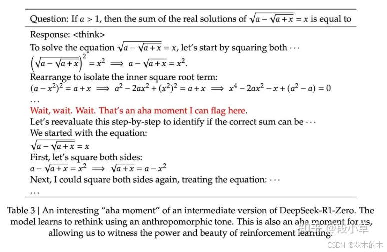 来自DeepSeek R1技术报告(https://arxiv.org/abs/2501.12948)的图,展示了「Aha moment」的出现。