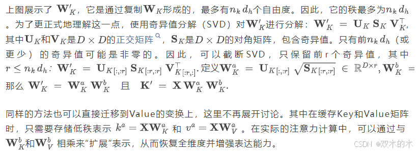 在Deepseek V2出来后,MLA架构巧妙地设计吸引了我。启发我做出CLOVER[2]这篇文章。MLA中存在一个absorb操作,能将Key Weight吸收到Query Weight中,Value Weight吸收到Output Weight中,缺点是合并后参数量会变大。CLOVER先合并再分解,不改变模型结构就能得到正交的注意力头,对剪枝和微调都有很大的好处;