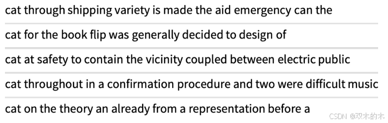 显然,这是一派胡言。那么,我们如何才能做得更好呢?就像对待字母一样,我们可以开始考虑的不仅仅是单个词的概率,还有成对的或更长的词的 n-grams 的概率。在成对的情况下,以下是我们得到的 5 个例子,所有情况都是从 “猫” 这个词开始的: