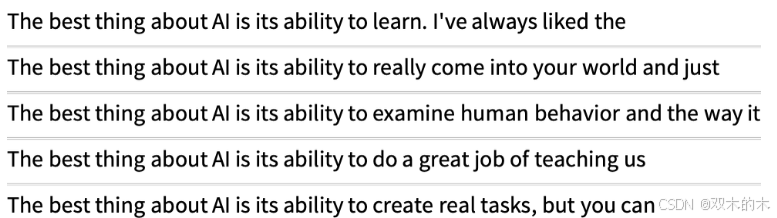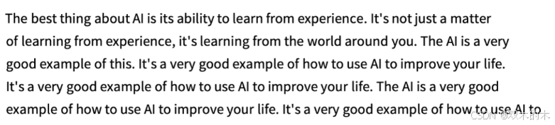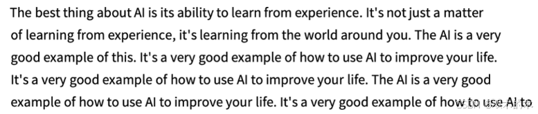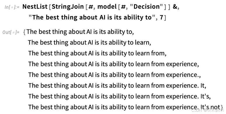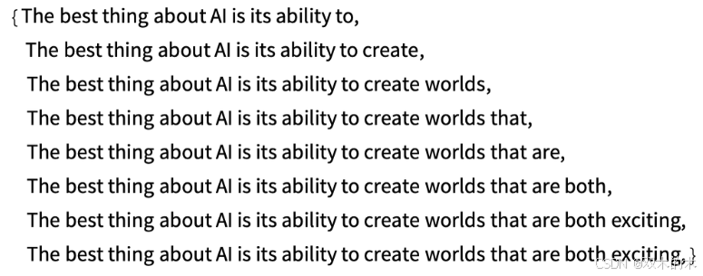 如果重复 “应用模型” —— 在每一步中加入概率最高的词(在此代码中被指定为模型的 “决定”),会发生什么: