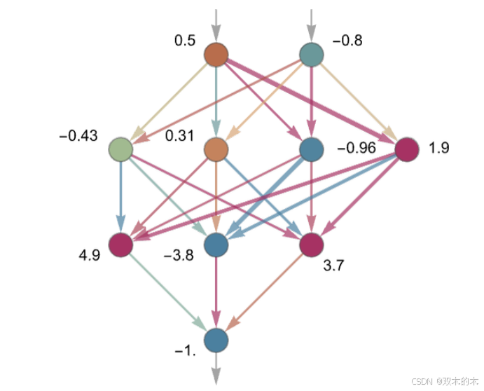 每个 “神经元” 都被有效地设置为评估一个简单的数字函数。为了 “使用” 这个网络,我们只需在顶部输入数字(如我们的坐标 x 和 y),然后让每一层的神经元 “评估它们的功能”,并通过网络向前输入结果 —— 最终在底部产生最终的结果。