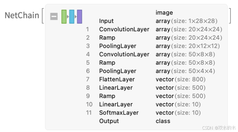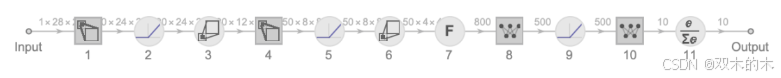 那么,这对数字识别网络来说是如何更详细地工作的呢?我们可以认为这个网络是由 11 个连续的层组成的,我们可以用图标来概括它(激活函数显示为独立的层):